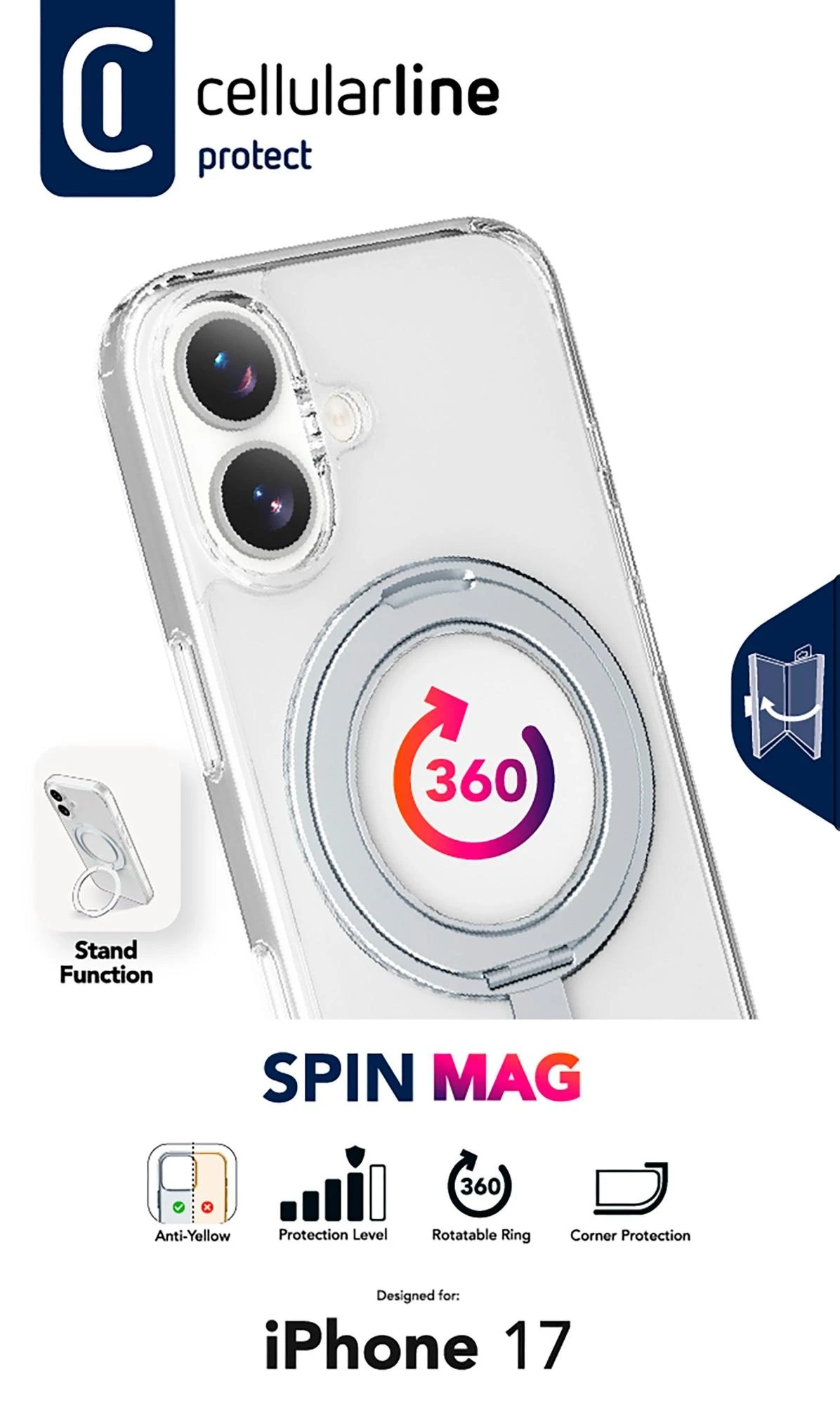 SPIN MAG ist die transparente Hülle mit drehbarem Ständer, die mit dem MagSafe-System kompatibel ist. Es zeichnet sich durch einen um 360 Grad drehbaren Ring aus, der es dem Gehäuse ermöglicht, verschiedene Funktionen wie Stand- und Halterungsfunktionen zu übernehmen. Der Ring ist integriert und wird bei Nichtgebrauch zu einem integralen Bestandteil des Gehäuses, sodass es mit MagSafe-Zubehör kompatibel ist. Die erhöhten Kanten rund um das Display und die Kamerabereiche schützen das Telefon vor versehentlichen Stößen und Stürzen.